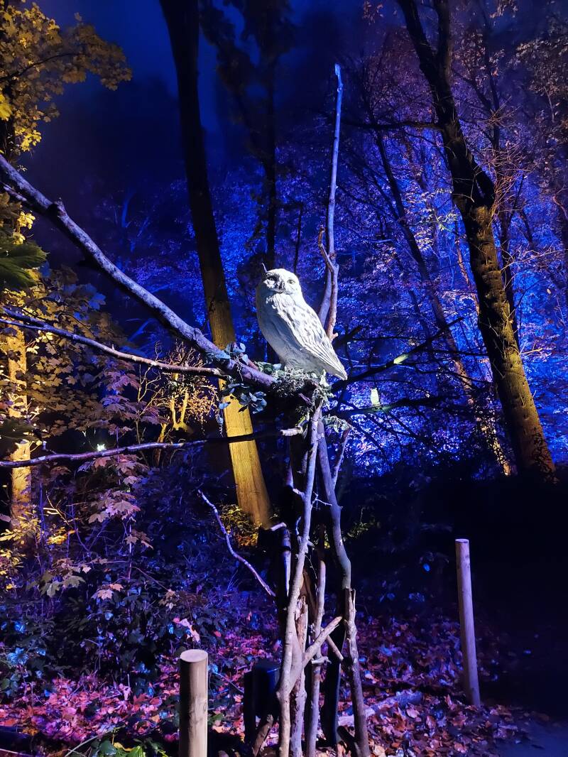 We volgen het pad verder tussen de lichtjes richting een klein pleintje waar we moeten verzamelen in groep voor we het bos ‘echt’ in mogen. Daar krijgen we nog een kleine lichtshow waarbij de lichten op het pleintje worden gedoofd met een ‘deluminator’ om de lichten van het bos te kunnen aansteken.