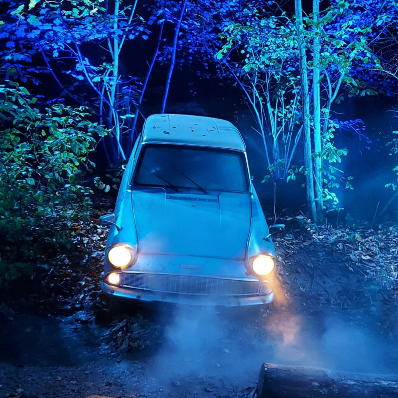 Het volgende op ons pad is een meer waar zich, via geluidsfragmenten, de scène uit de tweede film afspeelt waarbij Harry en Ron neerstorten met de magische auto van Ron’s vader. We horen stemmen, zien de koplampen bewegen door de bomen, en daarna een crash. Als we het pad dan verder blijven volgen komen we de neergestorte auto ook effectief tegen.