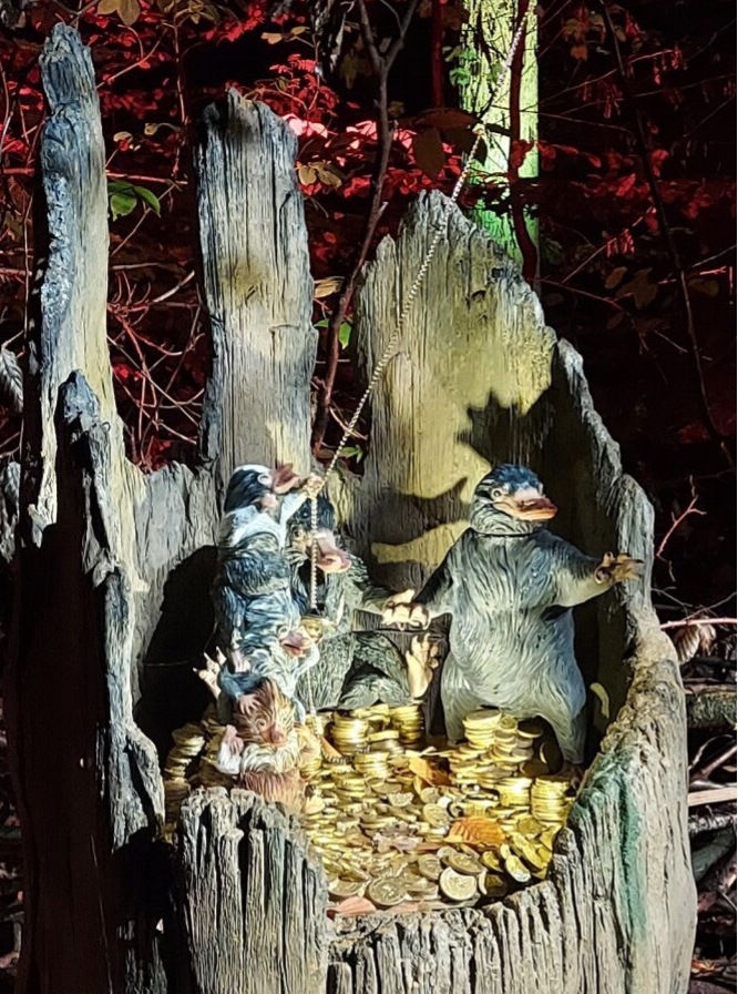 Doorheen het bos komen we ook telkens borden tegen die ons waarschuwen voor allerlei gevaar en magische wezens op de weg. Waaronder ook de ‘Nifflers’ en ‘Bowtruckles’ uit de Fantastic Beasts francise, maar ook de ‘Pygmy Puffs’ en ‘Cornish Pixies’ uit de Harry Potter films.