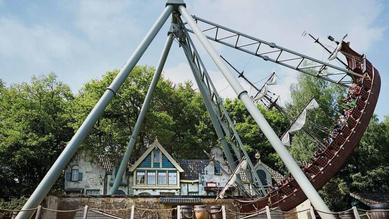 We lopen rond het meer verder richting de Halve Maen: een schommelend piratenschip. Opnieuw een van mijn favorieten en een attractie waar ik telkens nog van verschiet hoe hoog die effectief gaat.